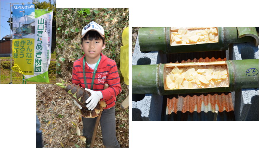 | 平成28年4月29日(日)、山口きらめき財団と共催で「たけのこ堀イベント」の開催。参加者スタッフ合わせて26名が参加。掘ったたけのこで筍ご飯を作り、全員で食べる。 |