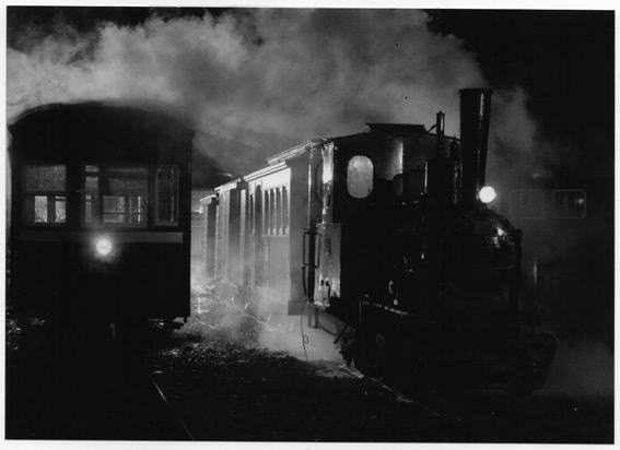 です。旧頚城鉄道のSL2号機は、ディーゼル車によって車庫から引き出されて、ライトアップとスモークの