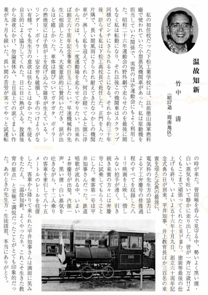 | 出展:公立高校退職校長会20周年記念誌(P55) 1981年 60周年記念事業の思い出「下工弁慶号」30年ぶりの修復作業&公開運転 |