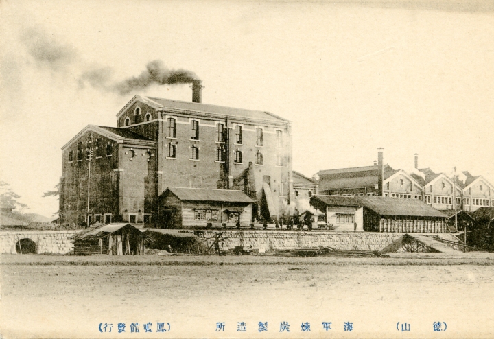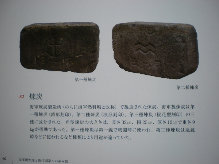 海軍煉炭製造所(後に海軍燃料廠と改称)で製造された煉炭。海軍製煉炭は第一種煉炭(錨形刻印)、第二種煉炭(波形刻印)、第三種煉炭(桜花型刻印)の三種に区分された。角型煉炭の大きさは、長さ32cm,幅25cm、厚さ12cmで重さ9kgが標準であった。第一種煉炭は第一線で戦闘時に使われ、第二種煉炭は巡航時などに使われるなど、種類により用途が違っていた。 |