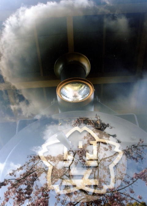 窓ガラスに写る煙突から出る煙をイメージした雲と、しだれ桜と、格納庫内のべんけい号、